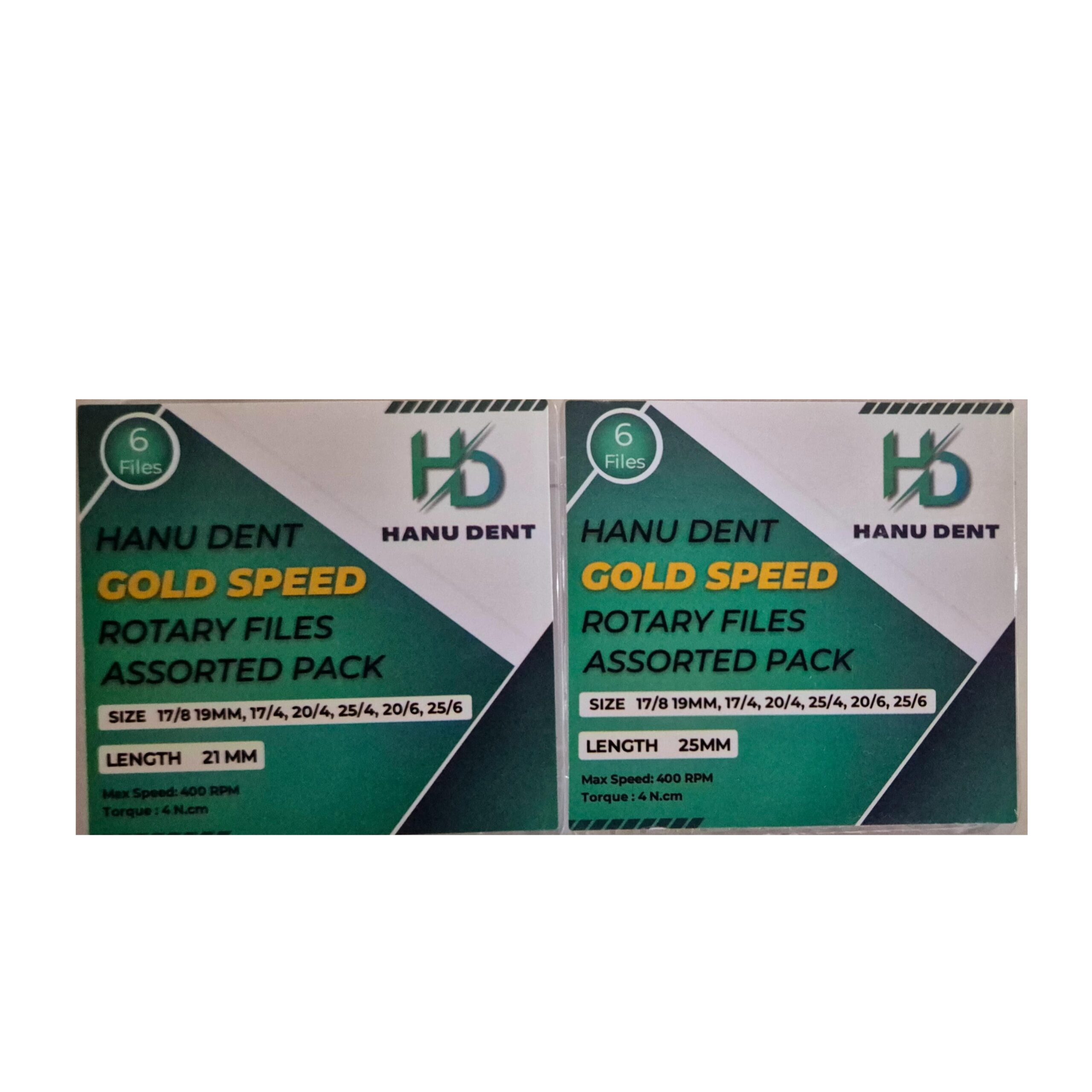 HanuDent Gold Speed Rotary Files assorted pack are endodontic instruments crafted for efficient and precise canal shaping in root canal treatments. These rotary files are engineered using high-quality, gold-hardened alloy, which enhances flexibility and fracture resistance. Designed with advanced cutting-edge technology, these files ensure a smoother and safer progression through the canal, minimizing the risk of transportation and perforation