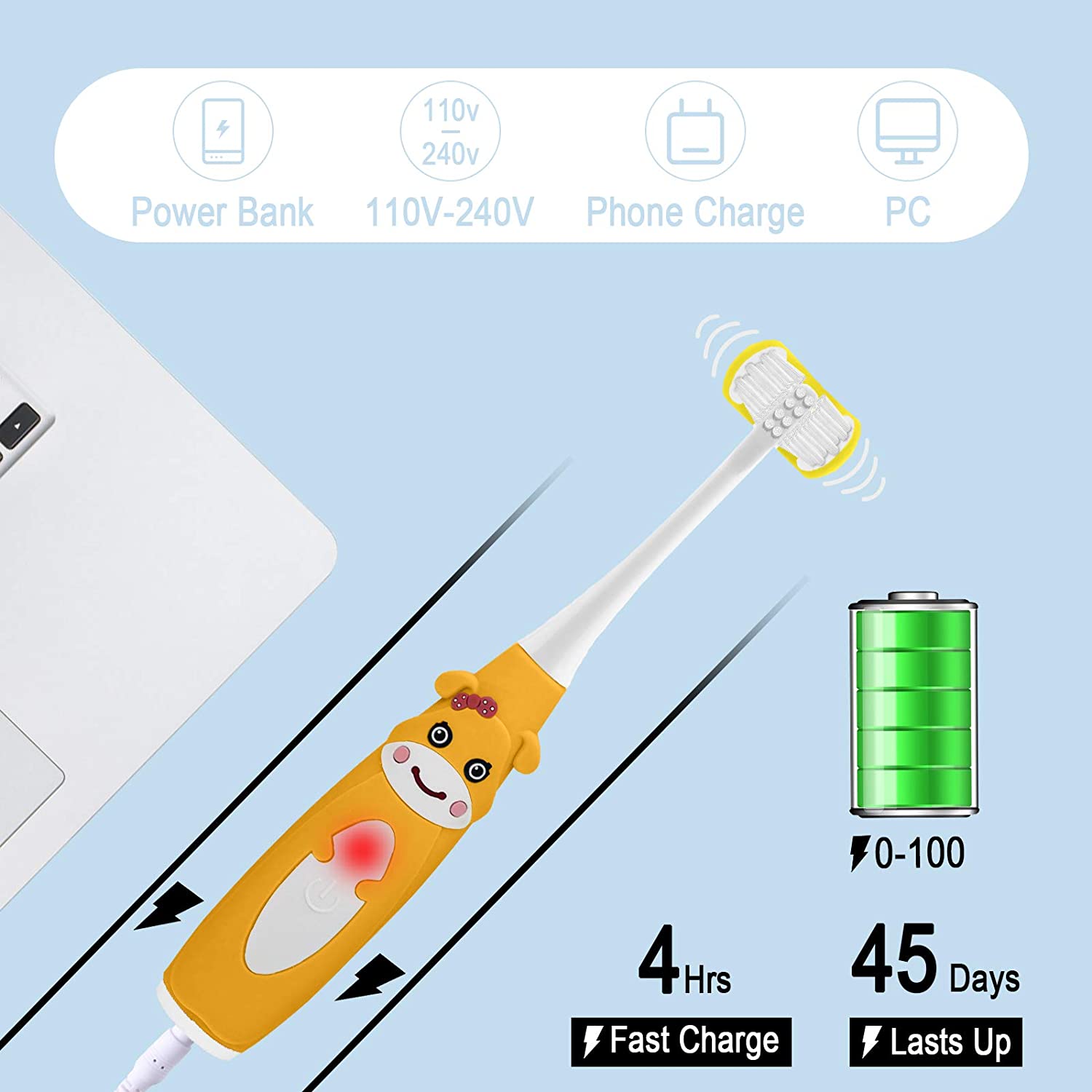 - ⚡️IPX7 Waterproof: Our cartoon kids toothbrushes are washable, reusable, safe for bathtub and shower. Rechargeable sonic kid toothbrush with 45 days between charges.Charging time: 4 hours.